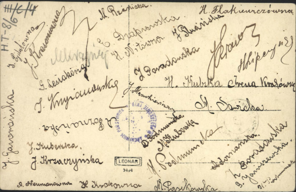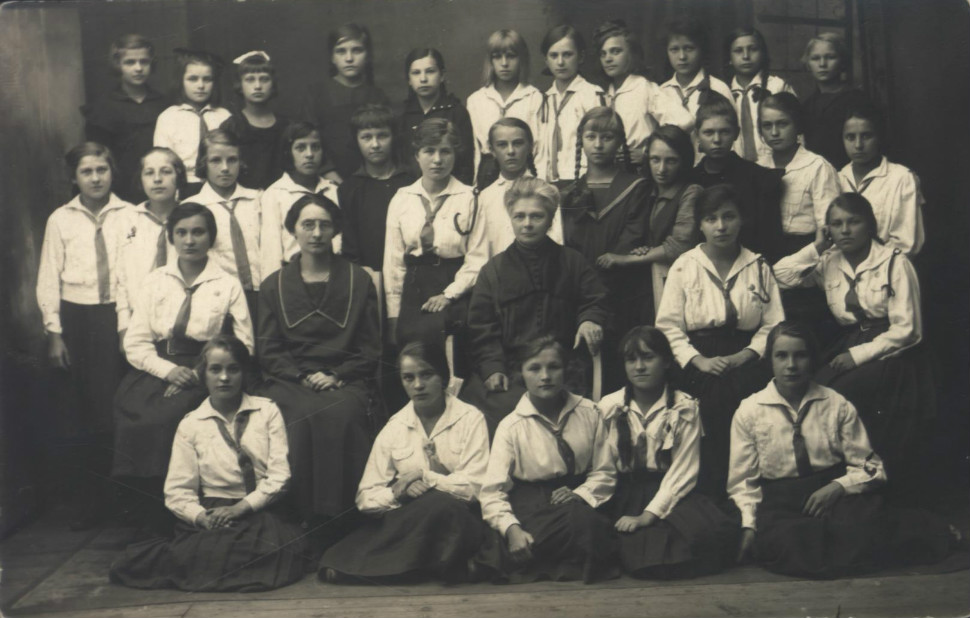 Fotografia uczennic i nauczycielek Gimnazjum Heleny Trzcińskiej w Piotrkowie. Na zdjęciu znajduje się Irena Krzyżanowska (Sendlerowa), zaś jej podpis widoczny jest na odwrocie fotografii. Okres międzywojenny.