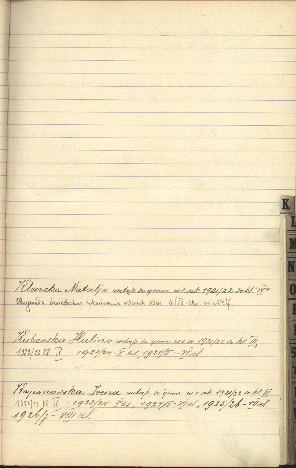 Wykaz wszystkich uczennic Gimnazjum Heleny Trzcińskiej (lata 1906-1933) zawierający informację o Irenie Krzyżanowskiej (Sendlerowej).