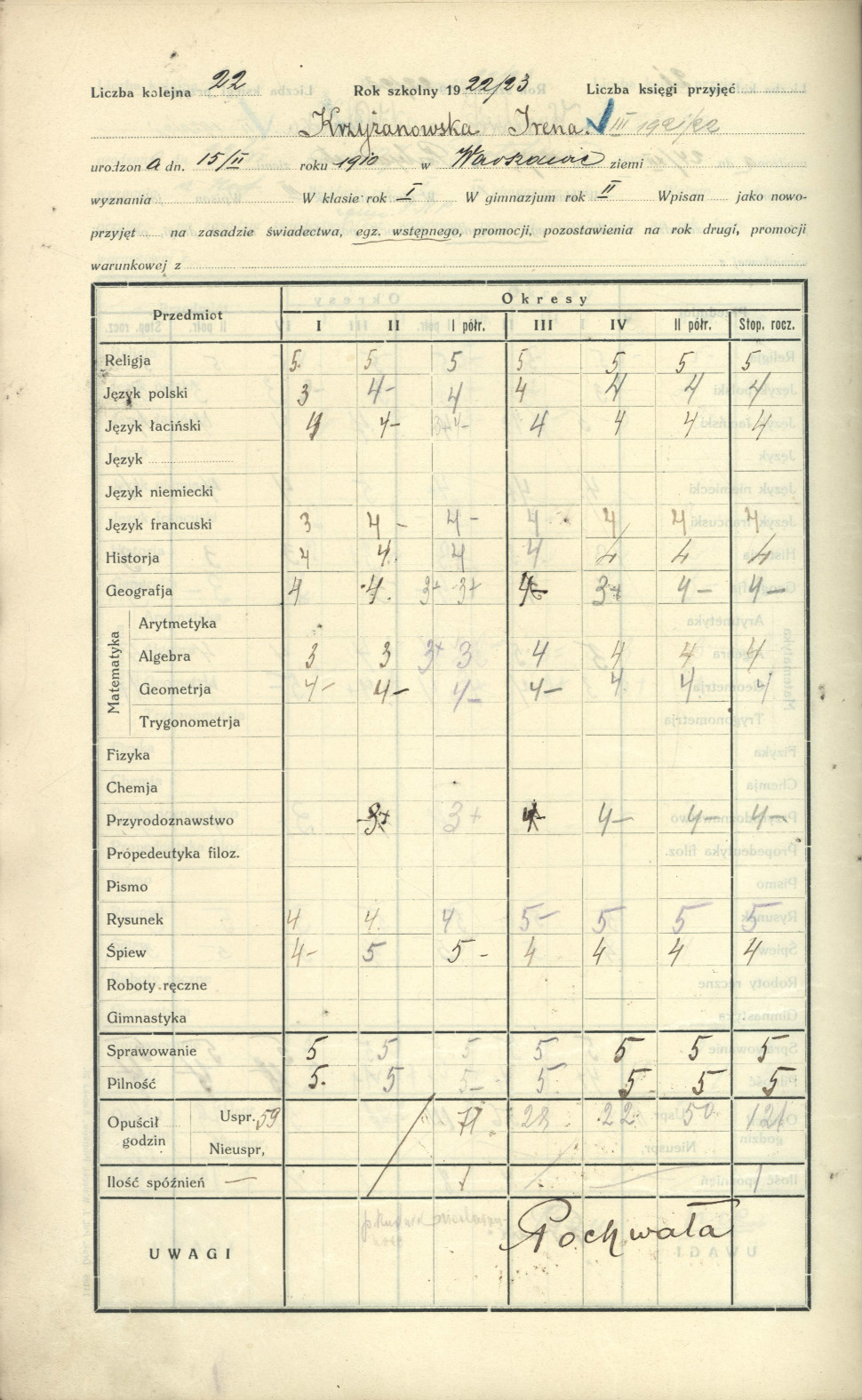 Arkusz ocen Ireny Krzyżanowskiej (Sendlerowej) z katalogu okresowego klasy IV w roku szkolnym 1922/23.