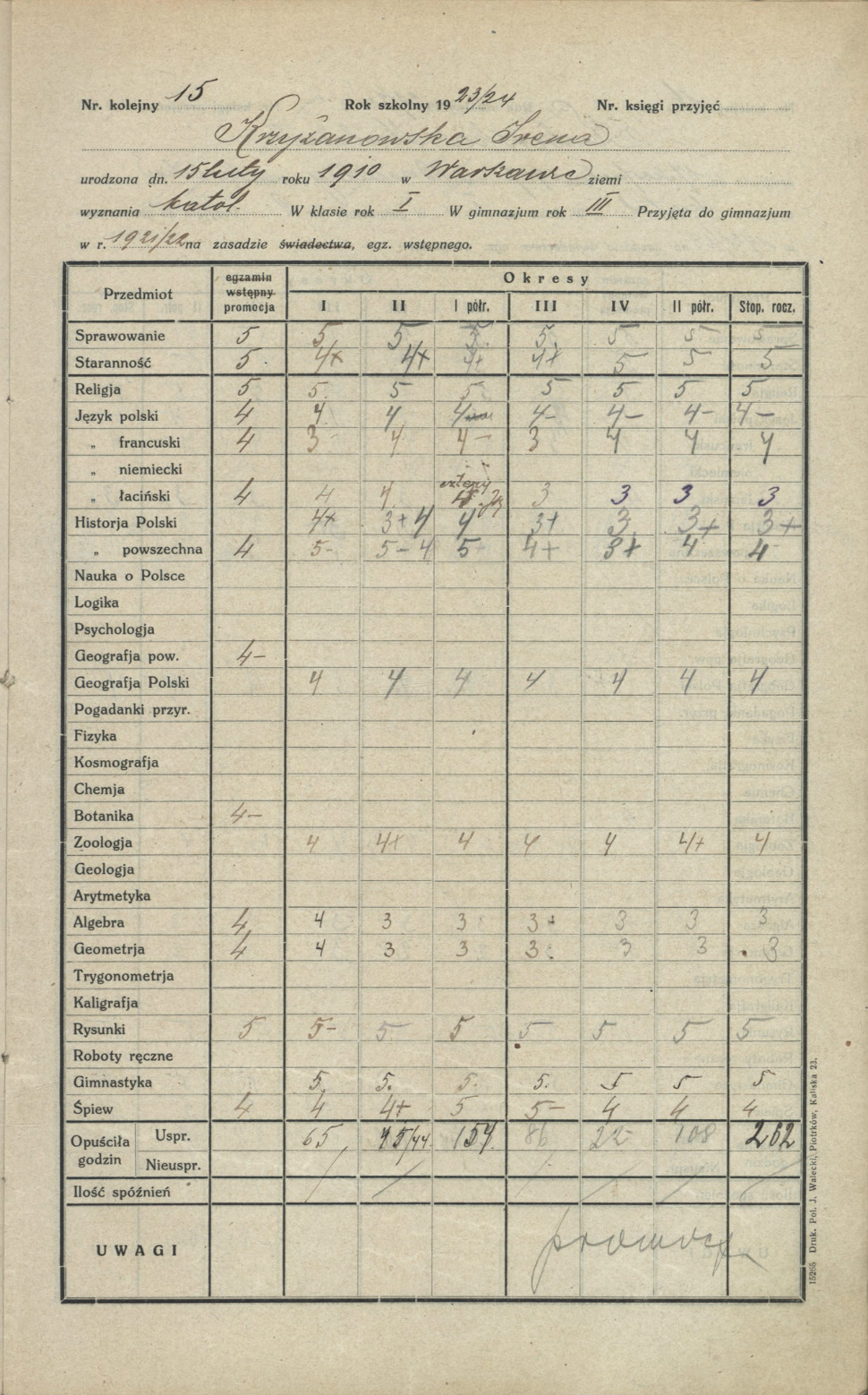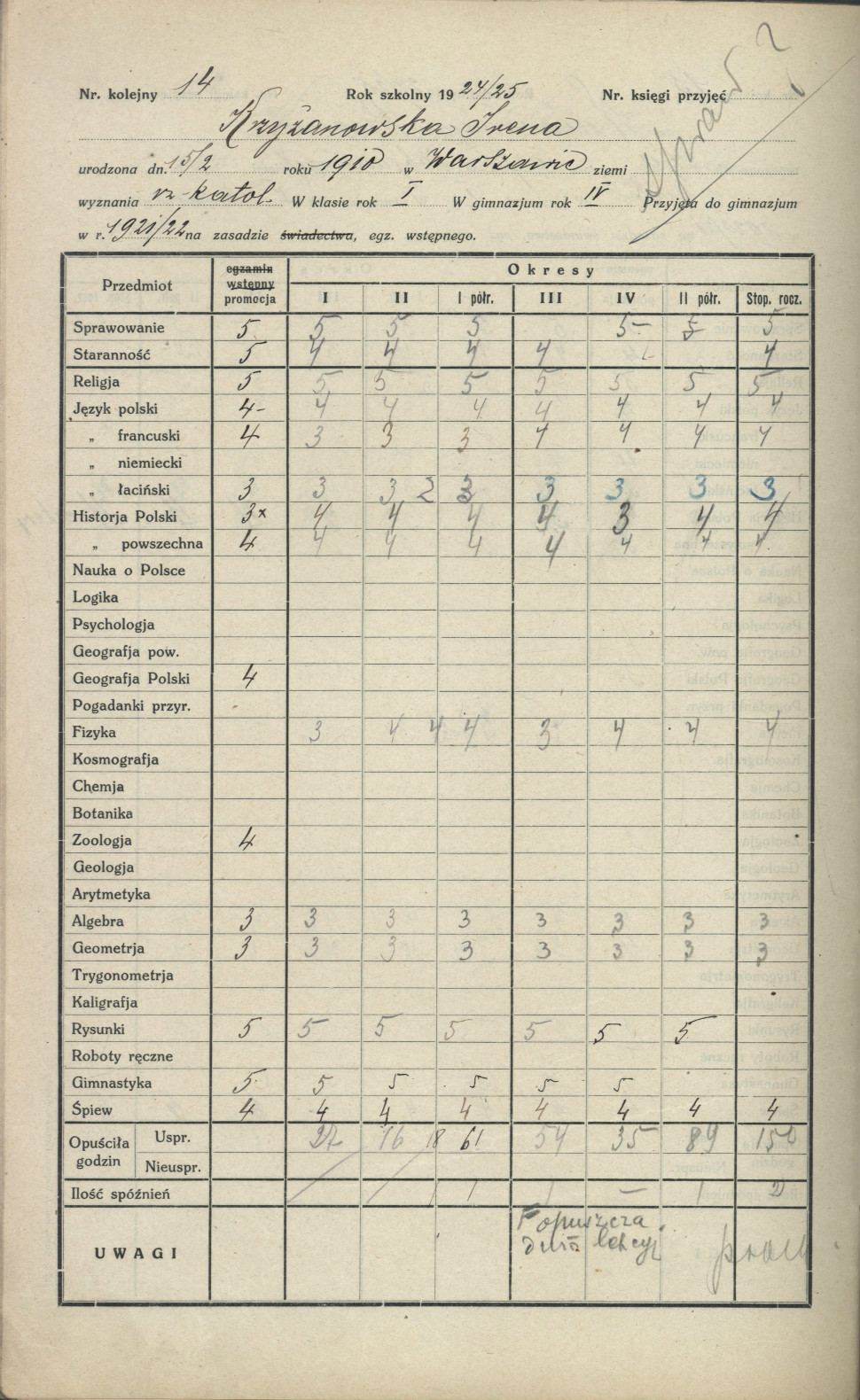 Arkusz ocen Ireny Krzyżanowskiej (Sendlerowej) z katalogu okresowego klasy V w roku szkolnym 1923/24.