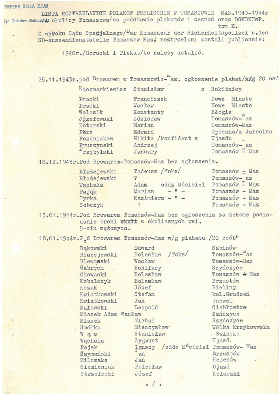 Lista rozstrzelanych publicznie Polaków w Tomaszowie Mazowieckim w latach 1943-1944