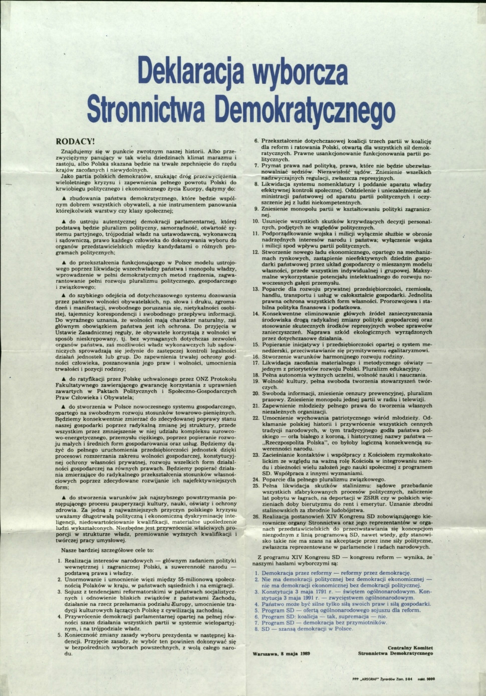 Deklaracja wyborcza SD, 1989