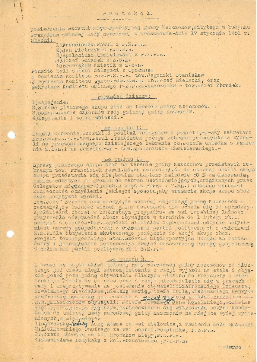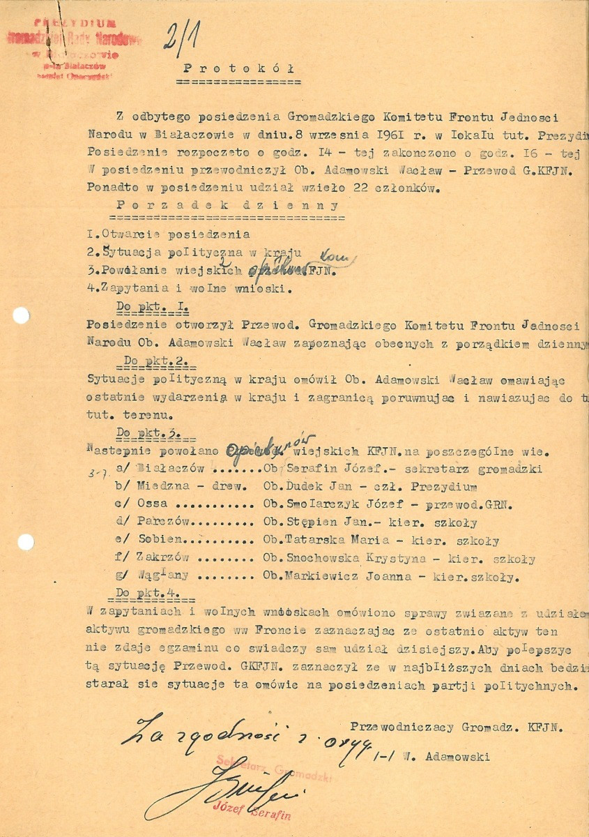 Protokół z posiedzenia Prezydium Powiatowego Komitetu FJN, 1961