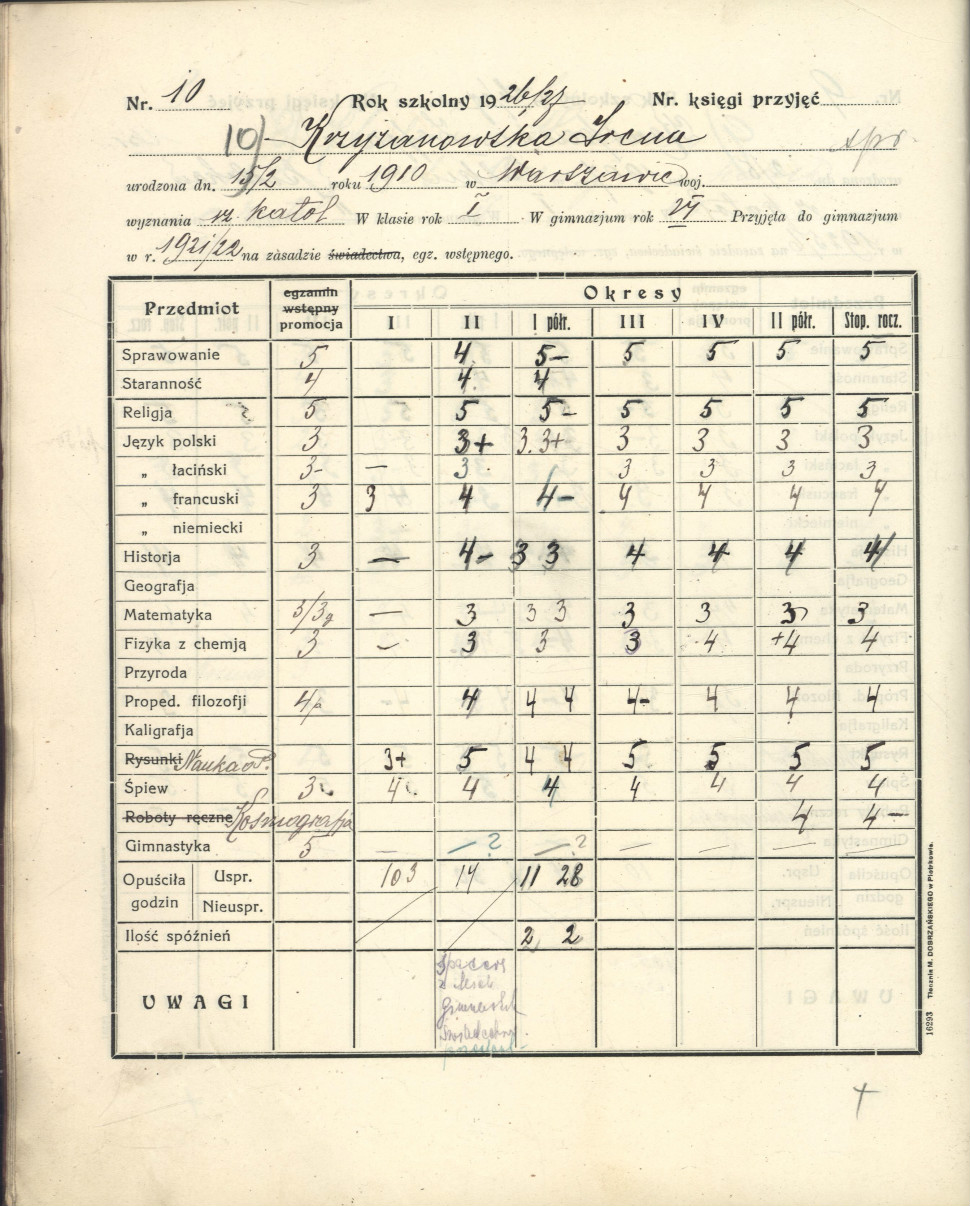 Arkusz ocen Ireny Krzyżanowskiej (Sendlerowej) z katalogu okresowego klasy VIII w roku szkolnym 1926/27.