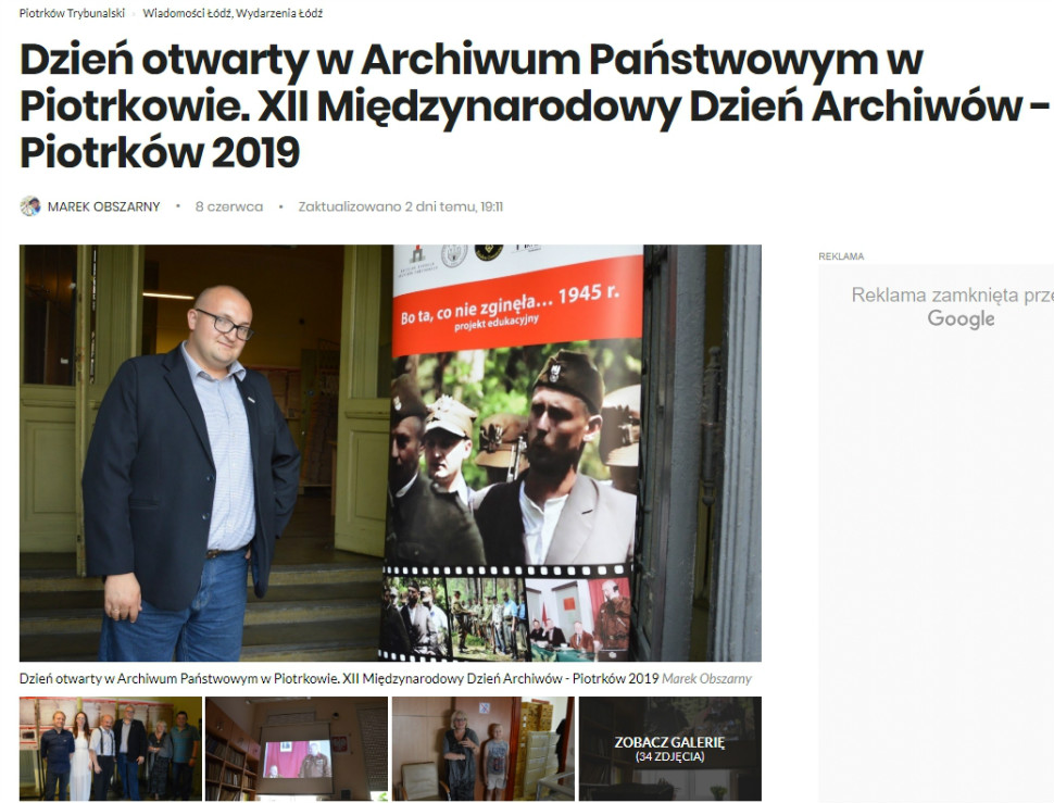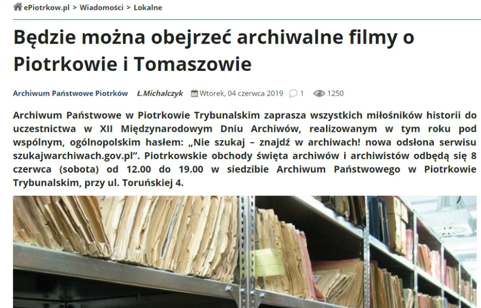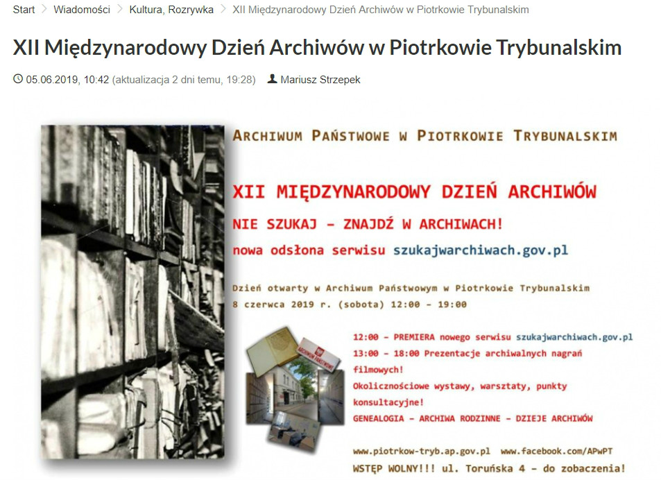 W sobotę 8 czerwca 2019 r. w siedzibie Archiwum Państwowego w Piotrkowie Trybunalskim miał miejsce dzień otwarty w ramach obchodów XII Międzynarodowego Dnia Archiwów. Tego dnia archiwa państwowe w całej Polsce świętowały pod wspólnym hasłem – „NIE SZUKAJ – ZNAJDŹ W ARCHIWACH! Nowa odsłona serwisu szukajwarchiwach.gov.pl”.